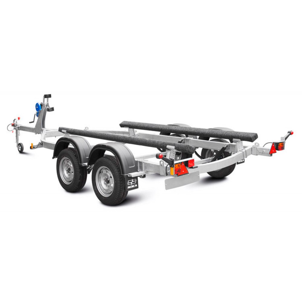 - Усиленная оцинкованная стальная рама выполнена из замкнутого профиля, имеет большой запас прочности и позволяет уберечь жгут электропроводки от внешних повреждений по все длине прицепа. Изогнутая конструкция поперечин рамыобеспечивает максимально низкую посадку судна, что снижает центр тяжести и повышает устойчивость прицепа во время движения.