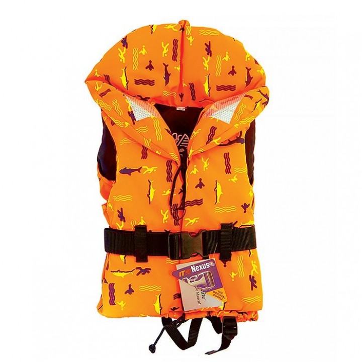 Спасательный жилет для детей младшего возраста оранжевого цвета (украшенный рисунками) общего назначения выполнены в традиционном стиле. Жилеты снабжены воротником для поддержки головы, светоотражающими элементами и сигнальным свистком. Жилет застёгивается с помощью застёжки-змейки, завязок и поясного ремня.